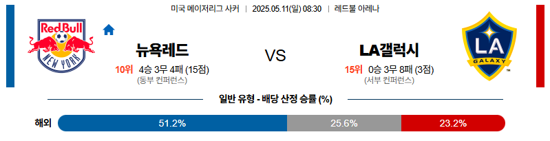 뉴욕 레드불스의 홈 강세와 LA 갤럭시의 부진을 고려할 때, 레드불스의 안정적인 승리가 예상됩니다. 레드불스가 초반에 선제골을 기록할 경우 높은 라인을 유지하며 상대를 지속적으로 압박할 수 있을 것입니다.