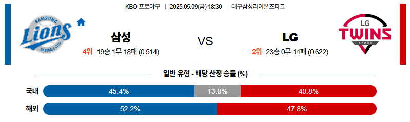 삼성의 선발 투수 후라도가 홈에서 좋은 성적을 내고 있는 점을 고려할 때, 이번 경기는 삼성의 승리가 예상됩니다. LG는 최근 외인 투수 상대로 고전하고 있으며, 삼성의 타선이 홈 경기에서 다소 개선될 가능성이 있습니다.