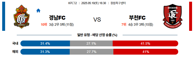 경남은 공격에서의 창의성 부재와 수비 안정감 부족으로 전력적으로 흔들리는 상태이며, 부천은 수비 전환에서 불안요소가 있지만 공격에서의 파괴력은 여전히 유지되고 있습니다. 다만 부천 역시 수비진 결장과 중원 조율 부재로 인해 경기 운영에 제한이 생길 가능성이 큽니다. 두 팀 모두 명확한 우세를 보이지 못한 가운데, 균형적인 흐름 속에서 무승부 가능성이 높고, 전체적으로 저득점 경기로 이어질 전망입니다.