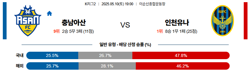 충남 아산은 공격 옵션 제한과 수비 간격 관리 실패로 인해 인천의 전방 압박과 박스 침투에 대응하기 어려운 구조입니다. 반면 인천은 삼각 공격 조합이 절정의 조화를 이루고 있으며, 조직력과 흐름 모두에서 아산을 압도할 수 있는 전력을 갖추고 있습니다. 초반 득점이 터질 경우 경기 양상은 일방적 흐름으로 흘러갈 가능성이 높고, 오버(2.5) 가능성도 충분합니다. 충남 아산의 수비 블록이 초반 버티기를 해낼 수 없다면, 인천의 압도적인 승리가 예상됩니다.
