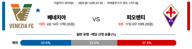 베네치아 대 피오렌티나 세리에A 05월13일 맞대결 생중계, 스포츠중계, 스포츠분석