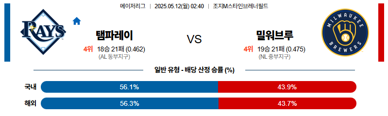 탬파베이 대 밀워키 MLB 05월12일 맞대결 생중계, 스포츠중계, 스포츠분석