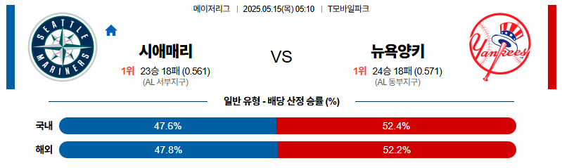 시애틀 대 뉴욕양키스 MLB 05월15일 맞대결 생중계, 스포츠중계, 스포츠분석