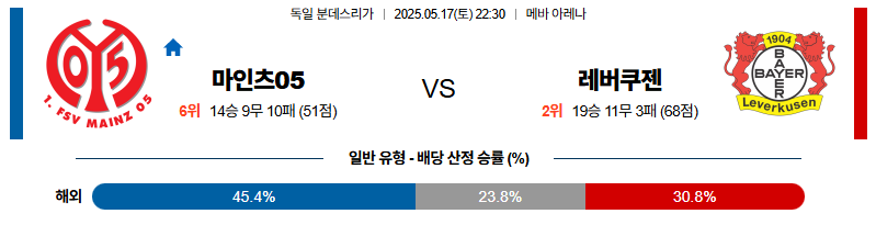 마인츠 대 레버쿠젠 분데스리가 05월17일 맞대결 생중계, 스포츠중계, 스포츠분석