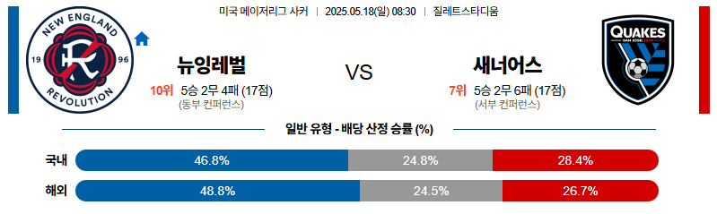 뉴잉글랜드 대 산호세 메이저리그사커 05월18일 맞대결 생중계, 스포츠중계, 스포츠분석