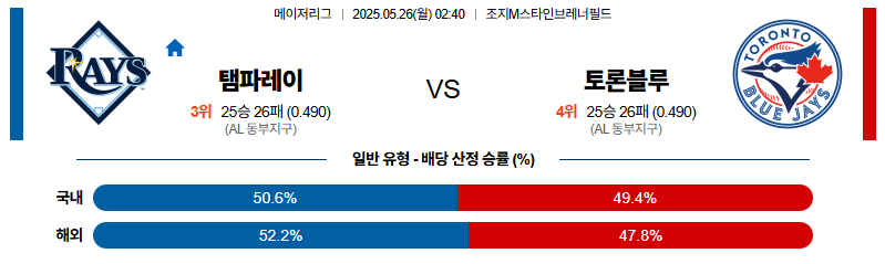 탬파베이 대 토론토 MLB 05월26일 맞대결 생중계, 스포츠중계, 스포츠분석