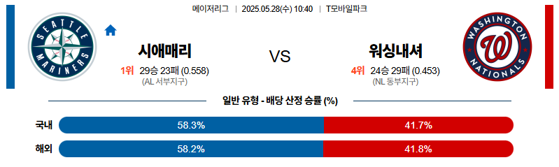시애틀 대 워싱턴 MLB 05월28일 맞대결 생중계, 스포츠중계, 스포츠분석