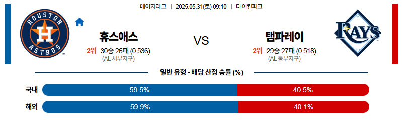 휴스턴 대 탬파베이 MLB 05월31일 맞대결 생중계, 스포츠중계, 스포츠분석