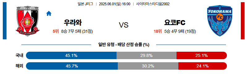우라와레즈 대 요코하마FC J리그1 06월01일 맞대결 생중계, 스포츠중계, 스포츠분석