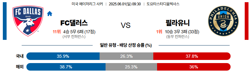 댈러스 대 필라델피아 메이저리그사커 06월01일 맞대결 생중계, 스포츠중계, 스포츠분석