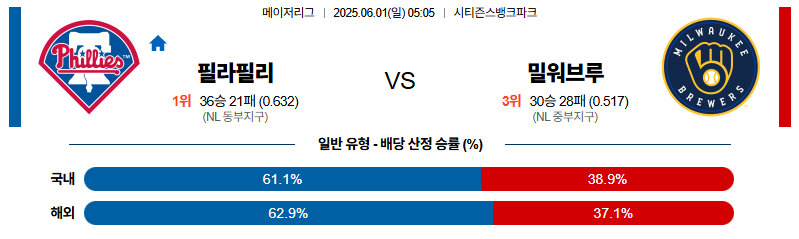 필라델피아 대 밀워키 MLB 06월01일 맞대결 생중계, 스포츠중계, 스포츠분석