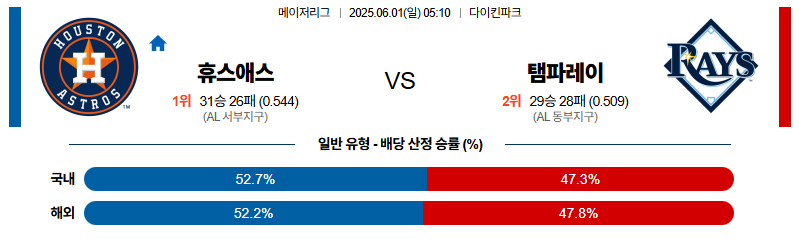휴스턴 대 탬파베이 MLB 06월01일 맞대결 생중계, 스포츠중계, 스포츠분석