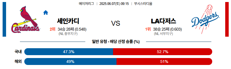 세인트루이스 대 LA다저스 MLB 06월07일 맞대결 생중계, 스포츠중계, 스포츠분석