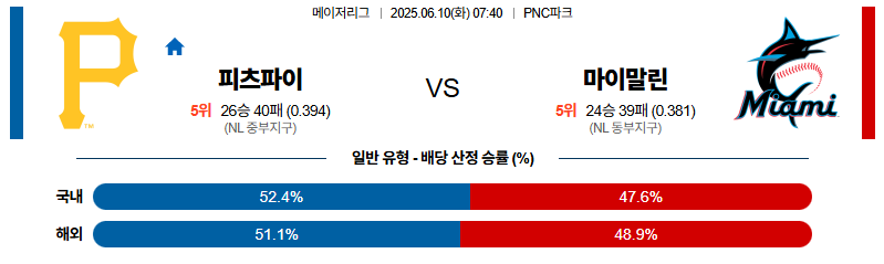 피츠버그 대 마이애미 MLB 06월10일 맞대결 생중계, 스포츠중계, 스포츠분석