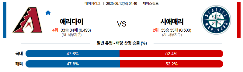 애리조나 대 시애틀 MLB 06월12일 맞대결 생중계, 스포츠중계, 스포츠분석