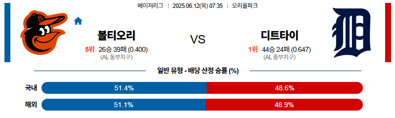 볼티모어 대 디트로이트 MLB 06월12일 맞대결 생중계, 스포츠중계, 스포츠분석