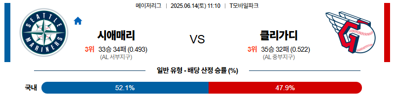 시애틀 대 클리블랜드 MLB 06월14일 맞대결 생중계, 스포츠중계, 스포츠분석