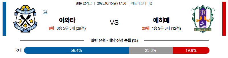 주빌로이와타 대 에히메 J리그2 06월15일 맞대결 생중계, 스포츠중계, 스포츠분석