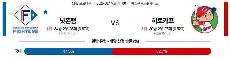 니혼햄 대 히로시마 NPB 06월14일 맞대결 생중계, 스포츠중계, 스포츠분석