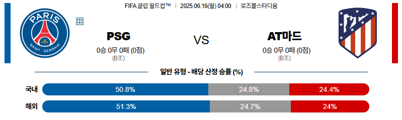 파리생제르망은 주축 자원의 결장으로 공격 전개 옵션이 제한되며, 전체적인 템포 조율도 흔들리는 모습을 보이고 있습니다. 반면 AT마드리드는 실리 전술에 기반한 수비 안정성과 빠른 전방 전환을 통해 강팀 공략에 최적화된 팀입니다. 전체적인 경기 흐름은 AT마드리드의 조직력 중심 전개가 더 안정적인 결과로 이어질 것으로 예상됩니다.