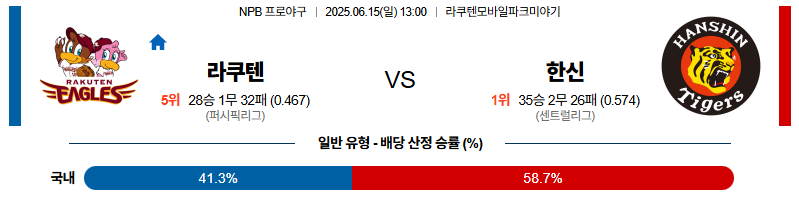 라쿠텐 대 한신 NPB 06월15일 맞대결 생중계, 스포츠중계, 스포츠분석