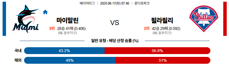 마이애미 대 필라델피아 MLB 06월17일 맞대결 생중계, 스포츠중계, 스포츠분석