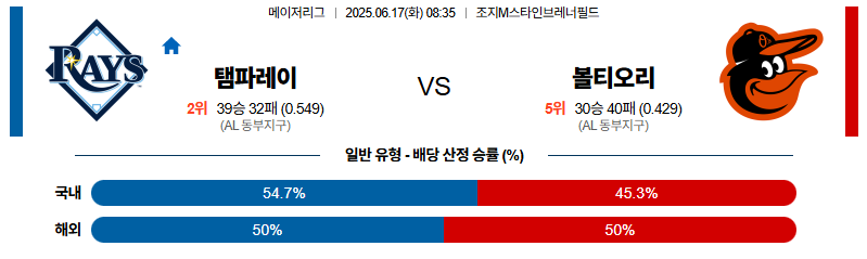 탬파베이 대 볼티모어 MLB 06월17일 맞대결 생중계, 스포츠중계, 스포츠분석