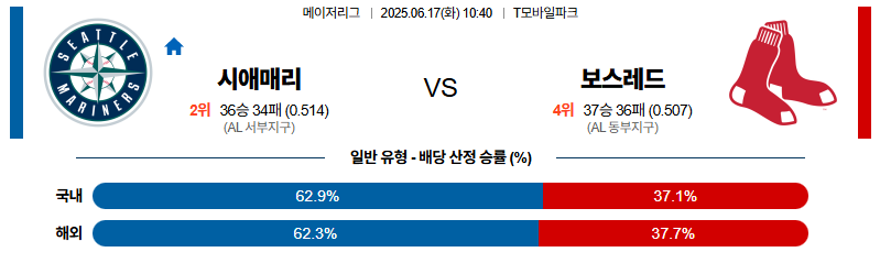 시애틀 대 보스턴 MLB 06월17일 맞대결 생중계, 스포츠중계, 스포츠분석