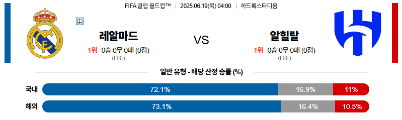 레알마드리드가 알 힐랄의 수비진의 느린 회전 속도와 간격 조절 실패를 정확히 공략할 가능성이 높습니다. 따라서 레알마드리드의 승리를 예상합니다.