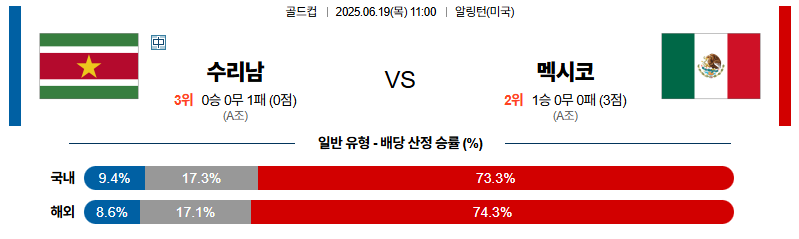 멕시코는 전술 중심축이 명확하고, 공격 전개와 수비 전환 모두에서 안정된 완성도를 보이는 팀입니다. 반면 수리남은 공수 양면에서 일관성이 떨어지고, 후방 압박을 받을 경우 흔들리는 구조가 반복되고 있습니다. 경기 내내 멕시코가 주도권을 쥔 채 흐름을 컨트롤할 가능성이 매우 높습니다.