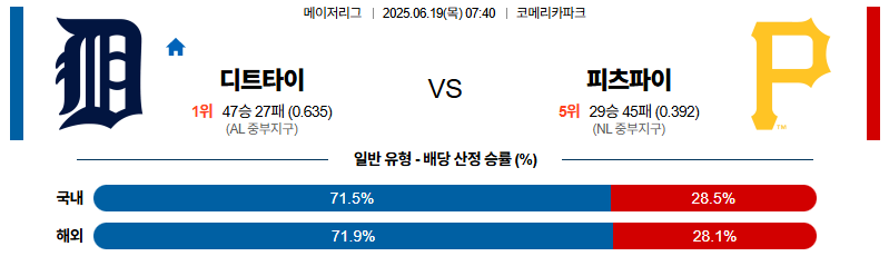 디트로이트 대 피츠버그 MLB 06월19일 맞대결 생중계, 스포츠중계, 스포츠분석