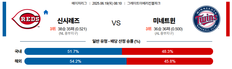 신시내티 대 미네소타 MLB 06월19일 맞대결 생중계, 스포츠중계, 스포츠분석