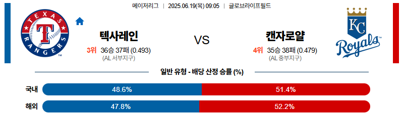 텍사스 대 캔자스시티 MLB 06월19일 맞대결 생중계, 스포츠중계, 스포츠분석
