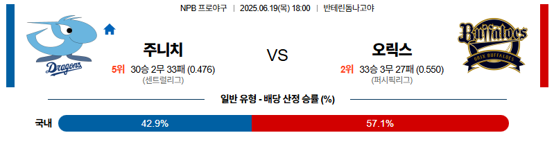 주니치 대 오릭스 NPB 06월19일 맞대결 생중계, 스포츠중계, 스포츠분석