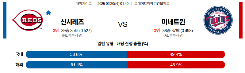 신시내티 대 미네소타 MLB 06월20일 맞대결 생중계, 스포츠중계, 스포츠분석