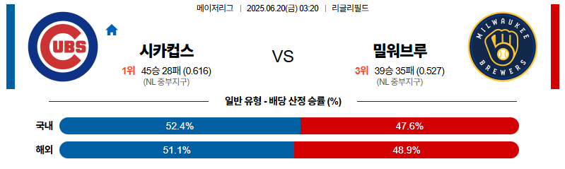시카고컵스 대 밀워키 MLB 06월20일 맞대결 생중계, 스포츠중계, 스포츠분석