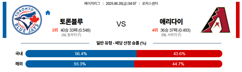 토론토 대 애리조나 MLB 06월20일 맞대결 생중계, 스포츠중계, 스포츠분석