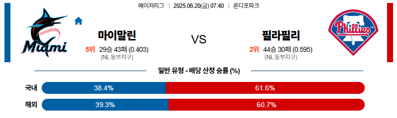 마이애미 대 필라델피아 MLB 06월20일 맞대결 생중계, 스포츠중계, 스포츠분석