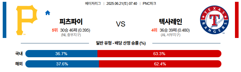 피츠버그 대 텍사스 MLB 06월21일 맞대결 생중계, 스포츠중계, 스포츠분석