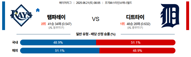 탬파베이 대 디트로이트 MLB 06월21일 맞대결 생중계, 스포츠중계, 스포츠분석