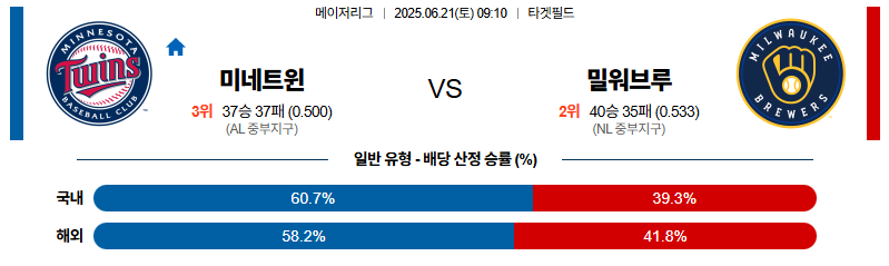 미네소타 대 밀워키 MLB 06월21일 맞대결 생중계, 스포츠중계, 스포츠분석