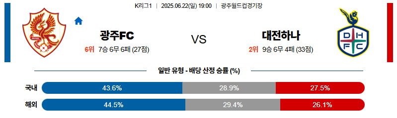 광주 대 대전 K리그1 06월22일 맞대결 생중계, 스포츠중계, 스포츠분석