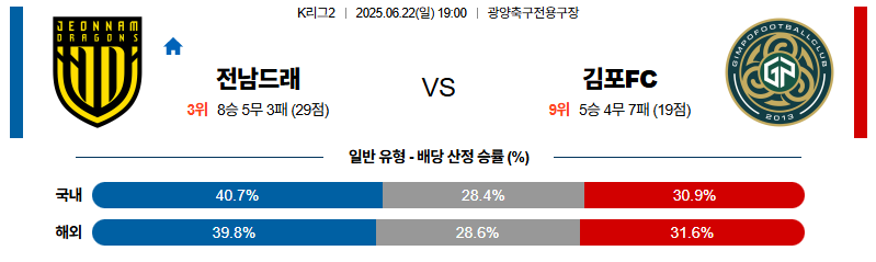 전남 대 김포 K리그2 06월22일 맞대결 생중계, 스포츠중계, 스포츠분석