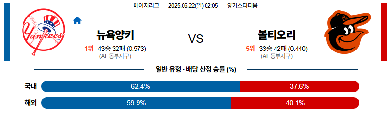 뉴욕양키스 대 볼티모어 MLB 06월22일 맞대결 생중계, 스포츠중계, 스포츠분석