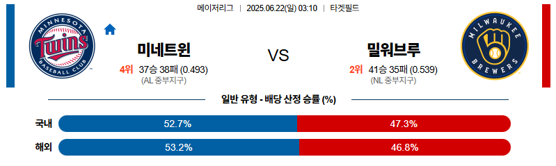 미네소타 대 밀워키 MLB 06월22일 맞대결 생중계, 스포츠중계, 스포츠분석