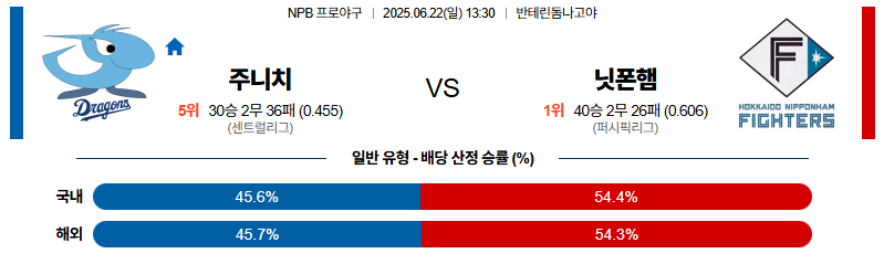 주니치 대 니혼햄 NPB 06월22일 맞대결 생중계, 스포츠중계, 스포츠분석
