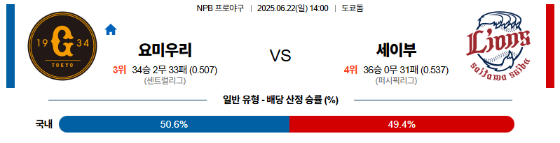요미우리 대 세이부 NPB 06월22일 맞대결 생중계, 스포츠중계, 스포츠분석