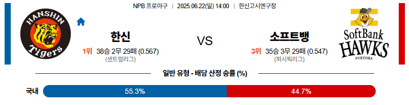 한신 대 소프트뱅크 NPB 06월22일 맞대결 생중계, 스포츠중계, 스포츠분석