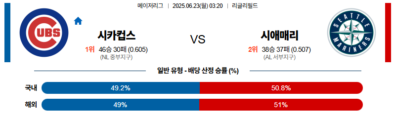 시카고컵스 대 시애틀 MLB 06월23일 맞대결 생중계, 스포츠중계, 스포츠분석