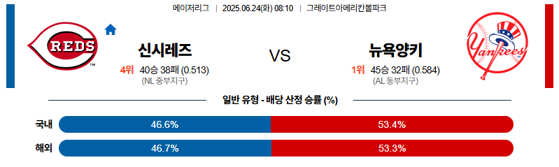 신시내티 대 뉴욕양키스 MLB 06월24일 맞대결 생중계, 스포츠중계, 스포츠분석
